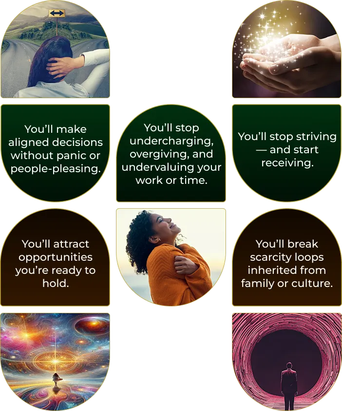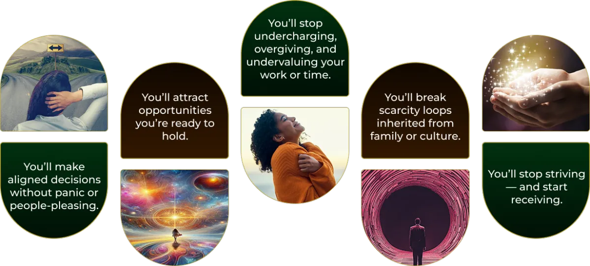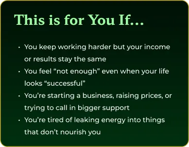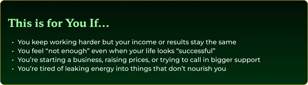 This is not a mindset fix. It’s an energetic clearing + recalibration that allows real-life flow: